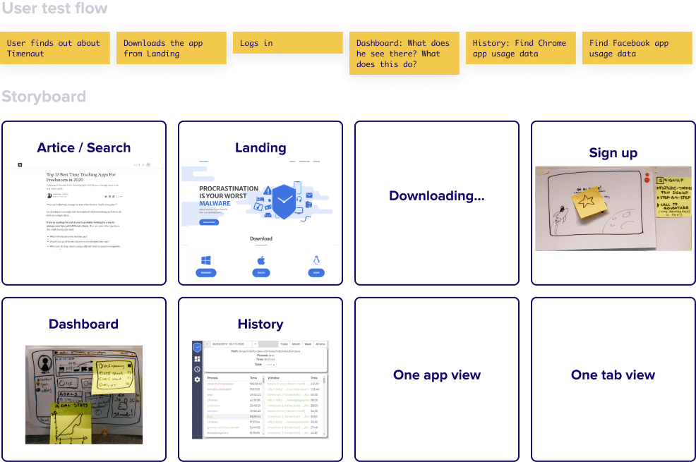After kickoff, I gathered all the info and put together a user test flow and a storyboard.